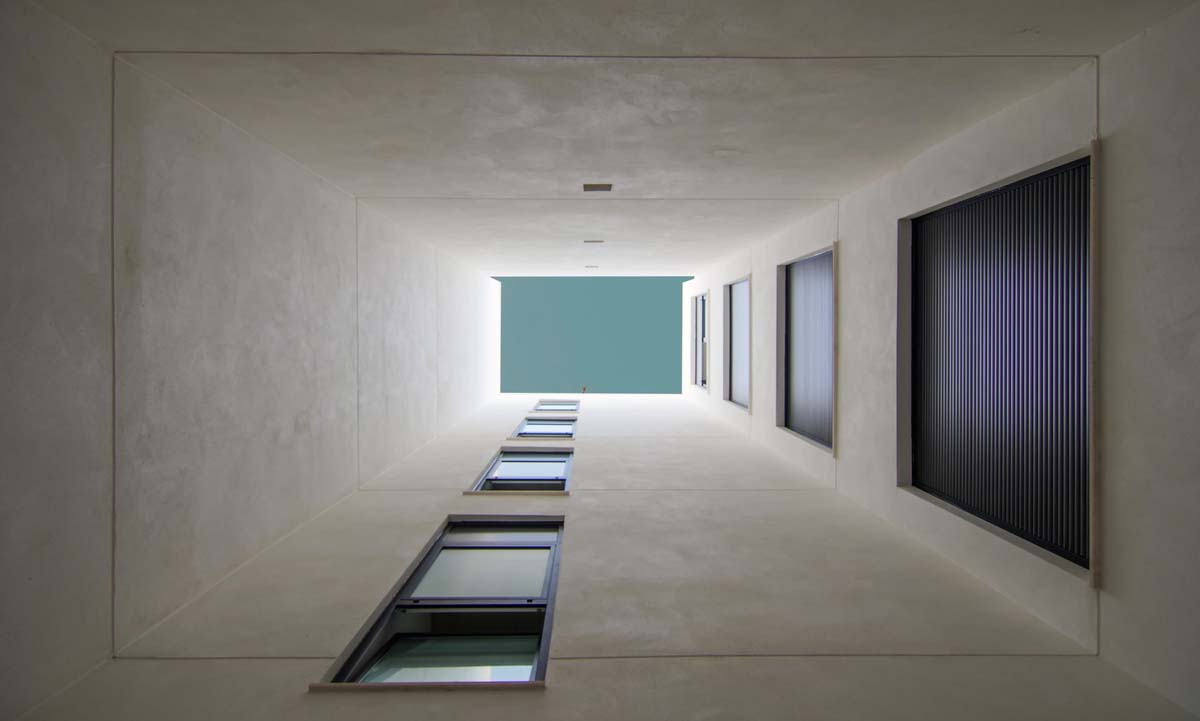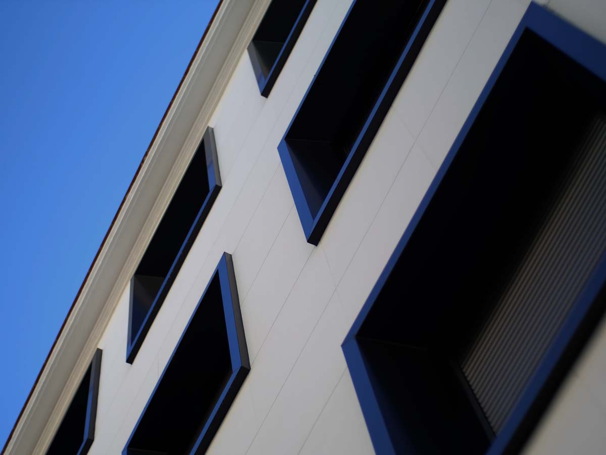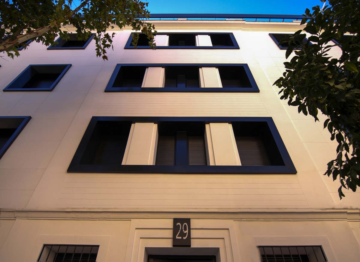 Fachada a vía pública ejecutada con mortero hidrófugo y pintura pétrea blanca. Ambos enfoscados interiormente, con proyectado de poliuretano y lana de roca y con trasdosados de cartón yeso.