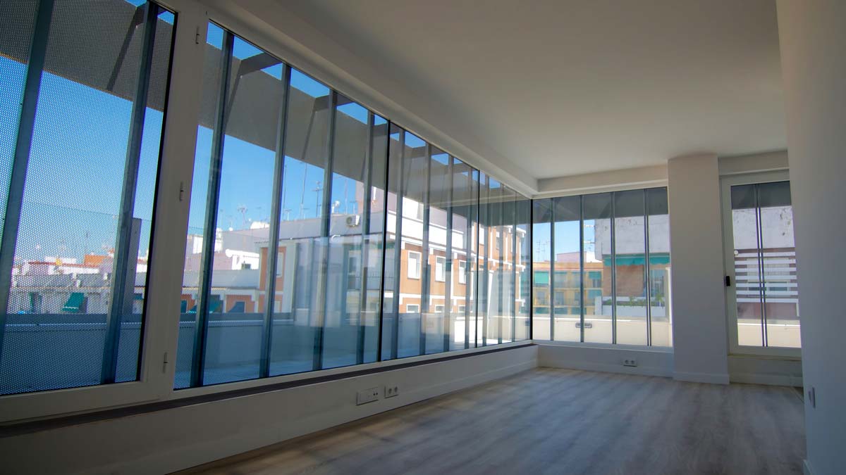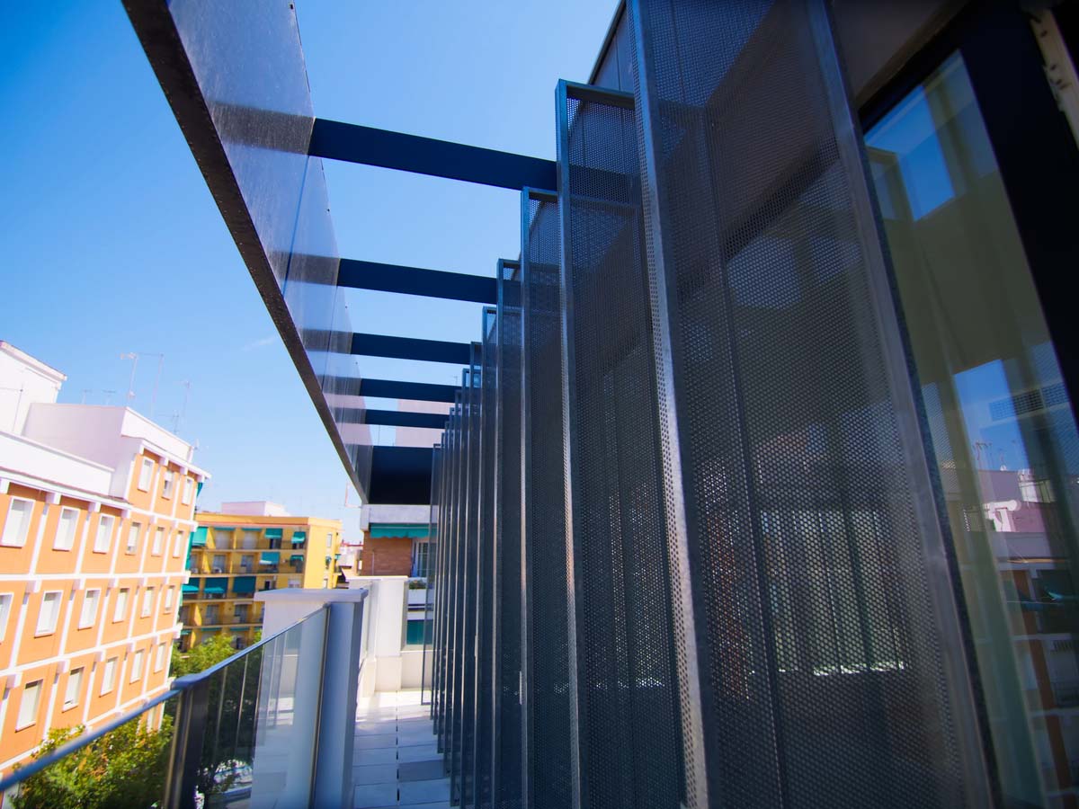 Carpintería exterior de aluminio lacado bicolor, con cierre abatible y persianas con accionamiento manual, capialzado de PVC y lama con poliuretano inyectado, con aireación natural incorporada en guía de persiana. Acristalamiento inteligente tipo "Guardian Sun". Rejas en planta baja.